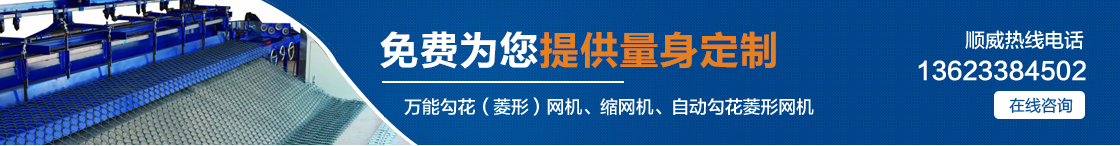 | 安平縣順威絲網(wǎng)機(jī)械設(shè)備制造有限公司自產(chǎn)自銷,省去中間環(huán)節(jié),讓利給客戶,真正的讓您省錢。主要產(chǎn)品有:萬能勾花(菱形)網(wǎng)機(jī)、縮網(wǎng)機(jī)、自動(dòng)勾花菱形網(wǎng)機(jī)、全自動(dòng)勾花菱形網(wǎng)機(jī)。 |